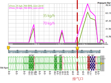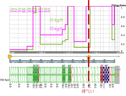 当出现上述结果时,会发生“冒料”现象。要解决此问题,需调整工艺配置,以降低排气口附近的局部填充率和压力。借助Ludovic软件可尝试多种解决方案。下面介绍两种可行的解决方案。 1. 降低喂料量(从70 kg/h降至35 kg/h)。