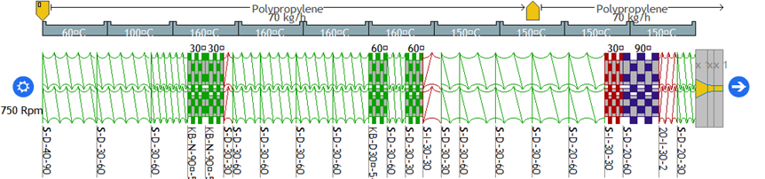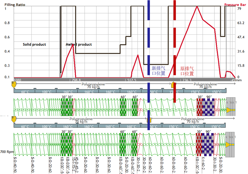 根据上述分析,若局部填充率和压力过高,这些排气口可能会出现溢料现象。借助Ludovic软件,可识别并解决这一溢料问题。Ludovic提供双螺杆挤出全工艺仿真,可以给出材料在沿着螺杆挤出方向上的压力、填充率等结果。同时在软件中可以自由调整螺纹元件排布,DOE分析可以优化工艺条件。 本文将结合 SCC公司一位客户的工业应用实例,介绍Ludovic软件“冒料”问题上的应用。 挤出机配置与问题 挤出机直径 : 27.2 mm,排气口位置#18号螺纹元件。